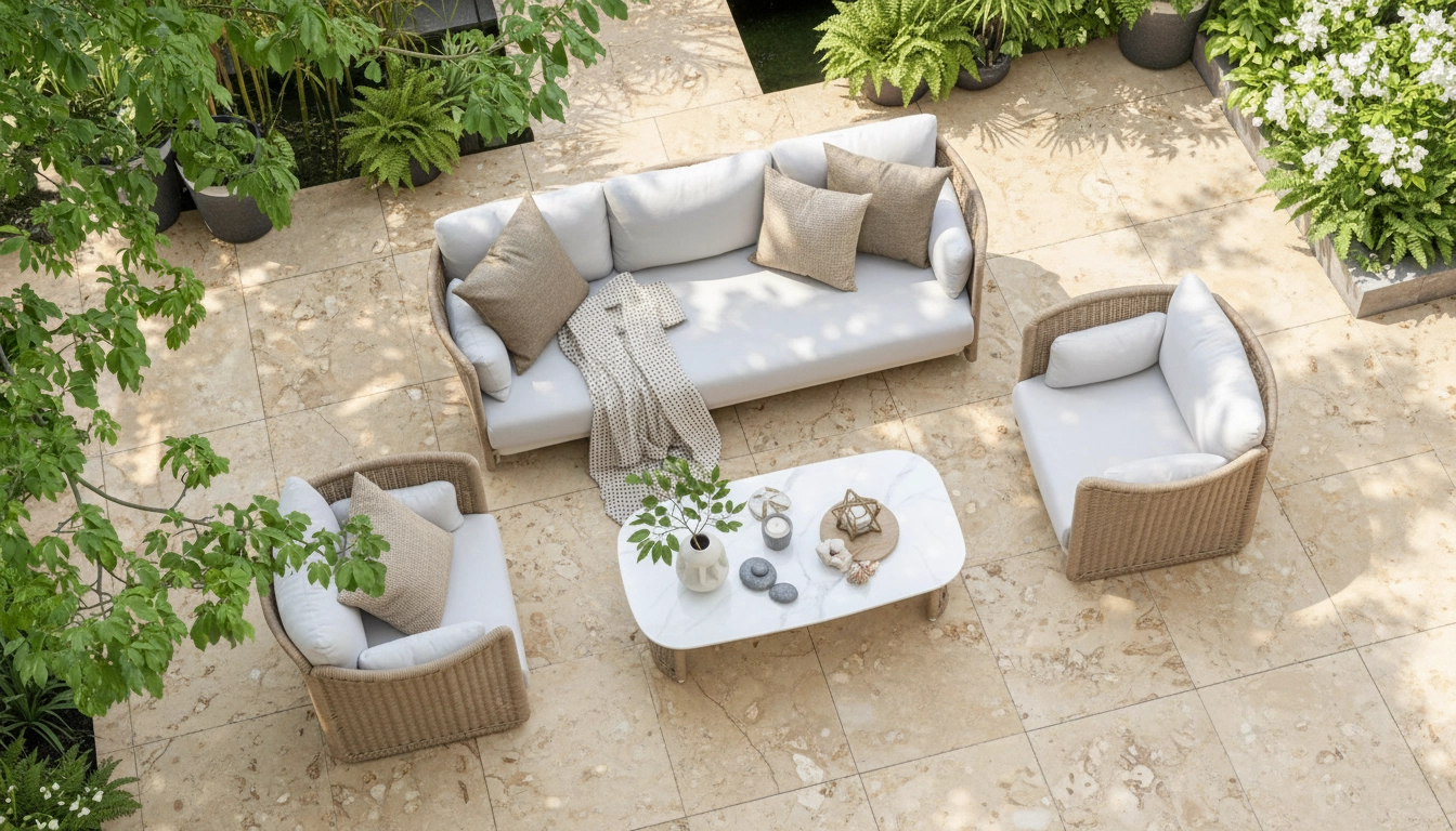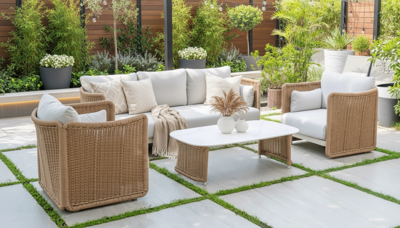 Castelle –Create a stunning look with castelle in your outdoor living space. This eye-catching VIRO HDPE twisted wicker is seamlessly hand woven around a fully welded aluminum frame. Its criss cross pattern, board arm structure and extra side cushions give a modern open air retreat feel.