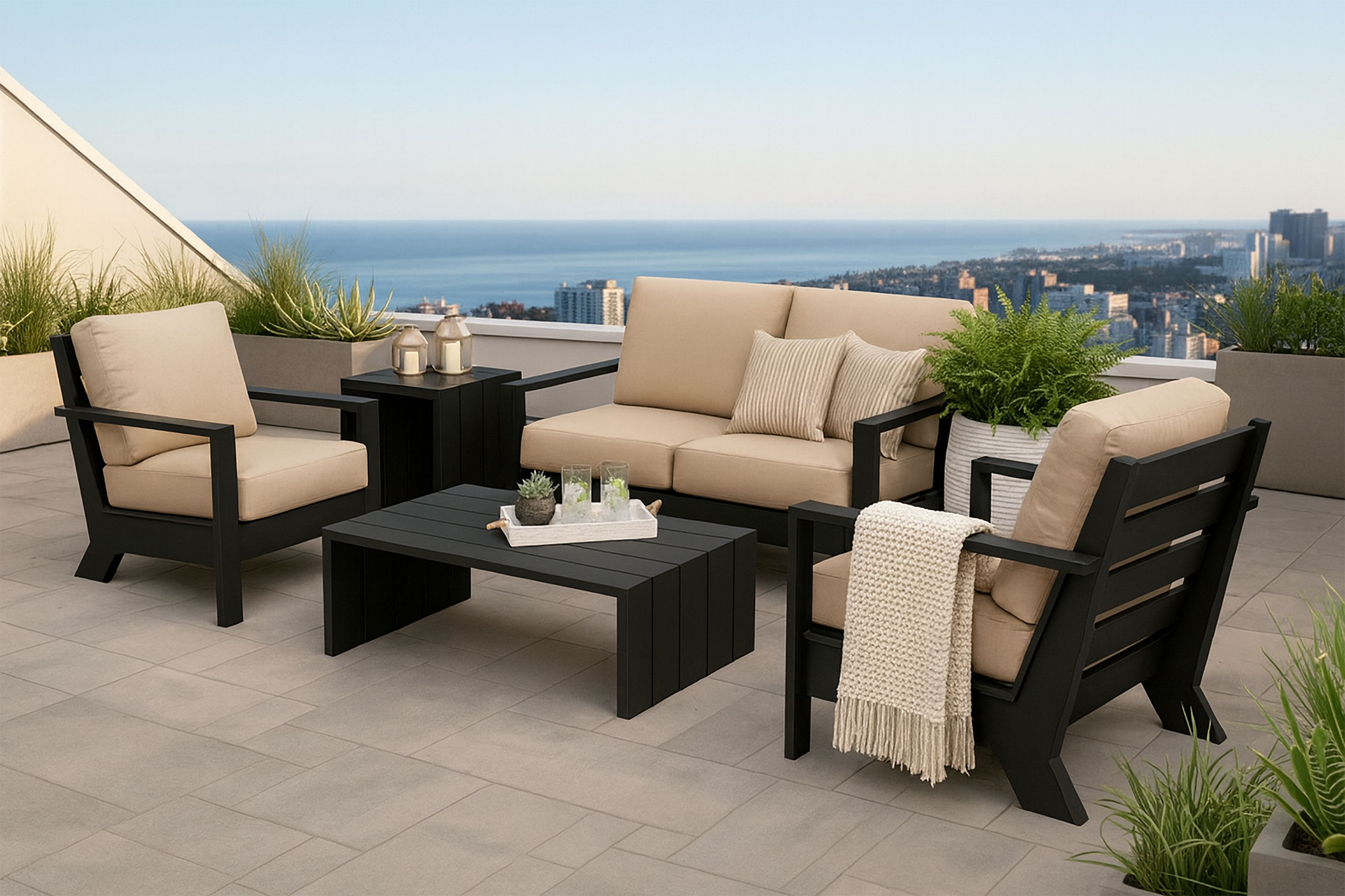 Riverside Convo Set– Crafted from premium-grade aluminum, the Riverside Collection from 2026 blends strength, modern design, and lasting durability. Each frame is finished with a weather resistant powder coat, ensuring resilience against the elements while maintaining a sleek, contemporary aesthetic. The clean lines and robust construction make Riverside a versatile choice for a wide range of outdoor settings. Its modular design allows for flexible configurations, whether styled as a sectional, corner piece, or stand-alone seating, making it an adaptable centerpiece for any patio or terrace. With its timeless silhouette and enduring build, the Riverside Collection delivers both sophistication and practicality, creating an inviting space for outdoor living that lasts season after season. Riverside features in Textured Black & Sable frame colors.